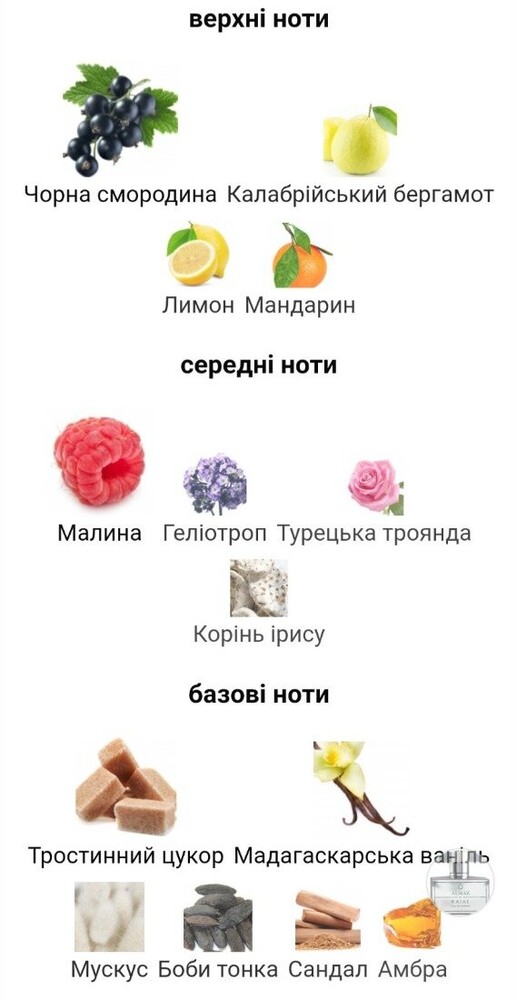 Верхні ноти: чорна смородина, калабрійський бергамот, лимон та мандарин.
