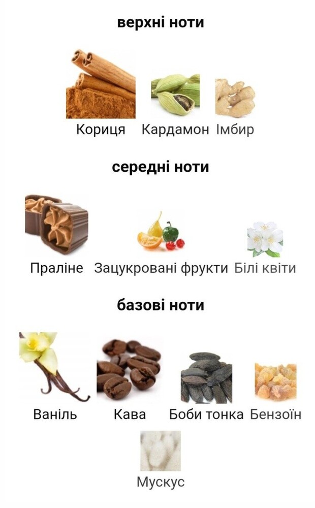 Базові ноти: ваніль, кава, боби тонка, бензоїн та мускус.