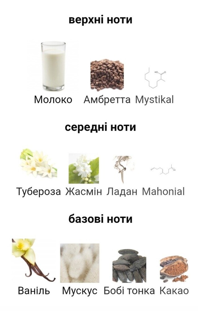 Верхні ноти: молоко, Амбретта (мускусна мальва).