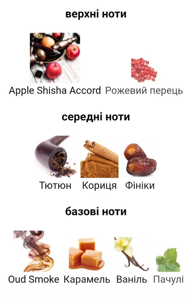 Верхні ноти: димні ноти, яблучний кальянний акорд, рожевий перець.