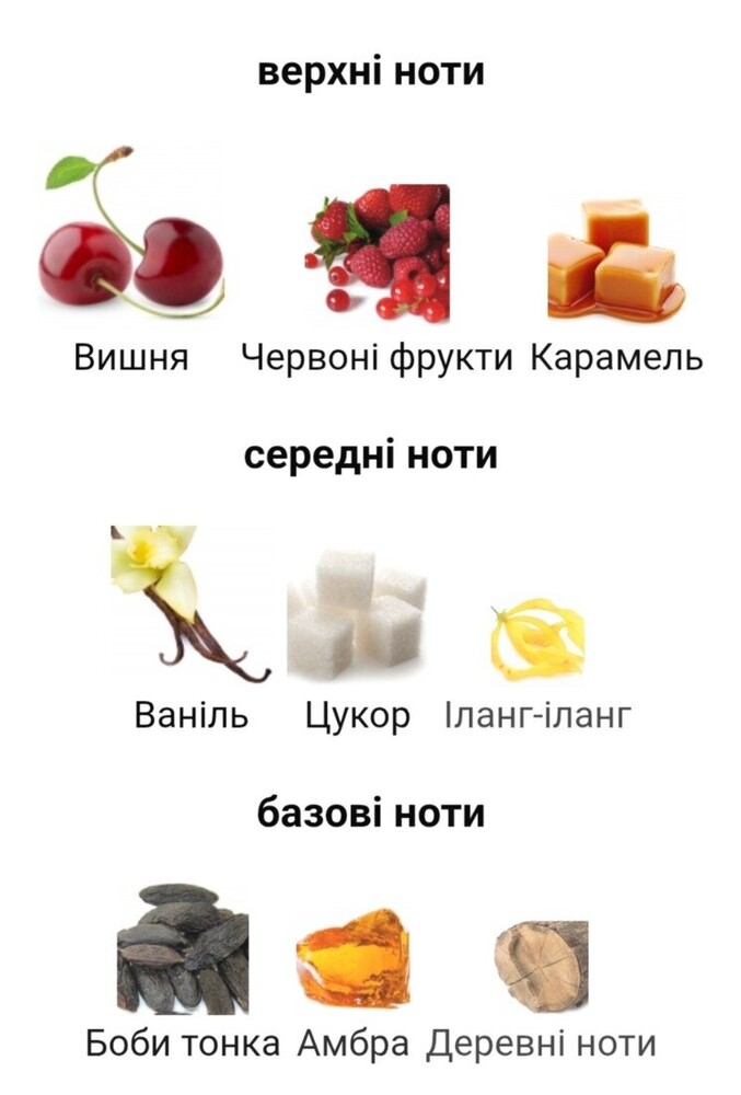 Аромат відкриває соковитий акорд стиглих червоних ягід, политих ніжною карамеллю, особливе місце займає розкішна вишня. У серці чуттєвий іланг-іланг з його банановими обертонами, насолоду посилює цукрова ваніль. У шлейфі мигдально-ванільні боби тонка, тепла амбра та елегантний акорд дорогої деревини.