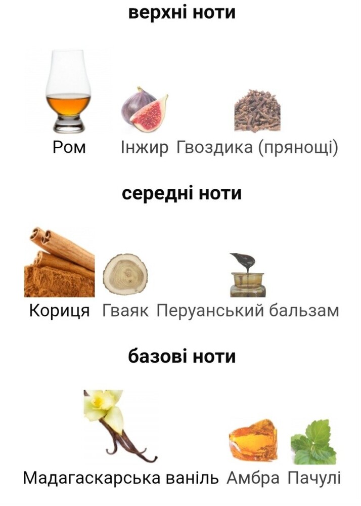Пряний ром у дубовій бочці з шоколадним нюансом пачулів, соковитий інжир з бархатистою ваніллю, ноти кориці надають пікантності, бальзам округляє та поєднує всі компоненти в єдине ціле.